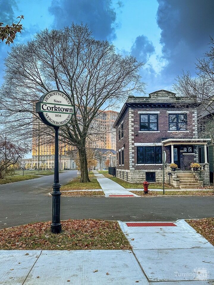 The image is a daytime photograph of the historic Corktown neighborhood in Detroit, Michigan. The scene captures a blend of historic architecture and urban development.