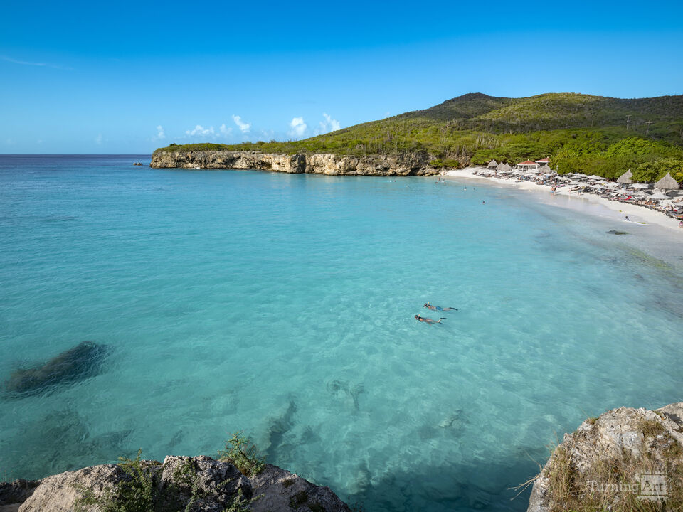 The stunning turquoise waters of Grote Knip beach, also known as Kenepa Grandi, are seen from a high viewpoint in Curacao.