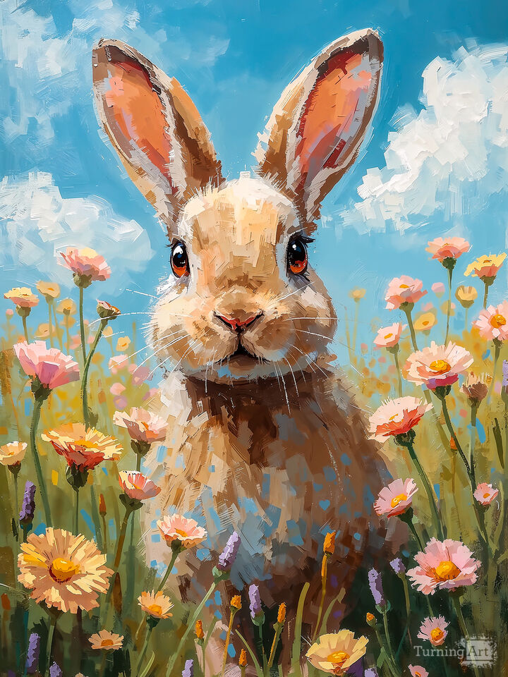 A charming rabbit stands amid a meadow of colorful flowers. The bright blue sky adds a cheerful backdrop to the scene. Joyful art created with AI plus other digital editing in a modern painting style.