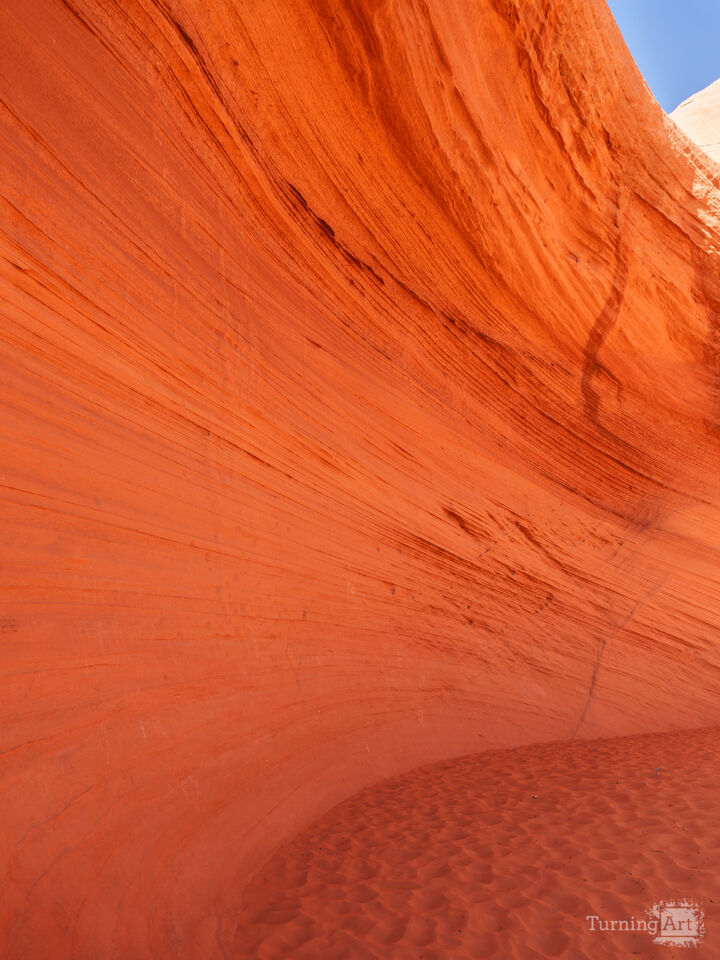 A unique view of the curved textures along the sandstone walls inside the secret Shell Sand Cave near Page, Arizona, USA. It's really more of an alcove. The evening sun was making the cliff and sand glow a natural bold orange color that just exploded with light. Check out the thin lines of layers. There is a peak of blue sky above. This is behind a Shell Gas Station on Highway 89. It is very popular on social media.