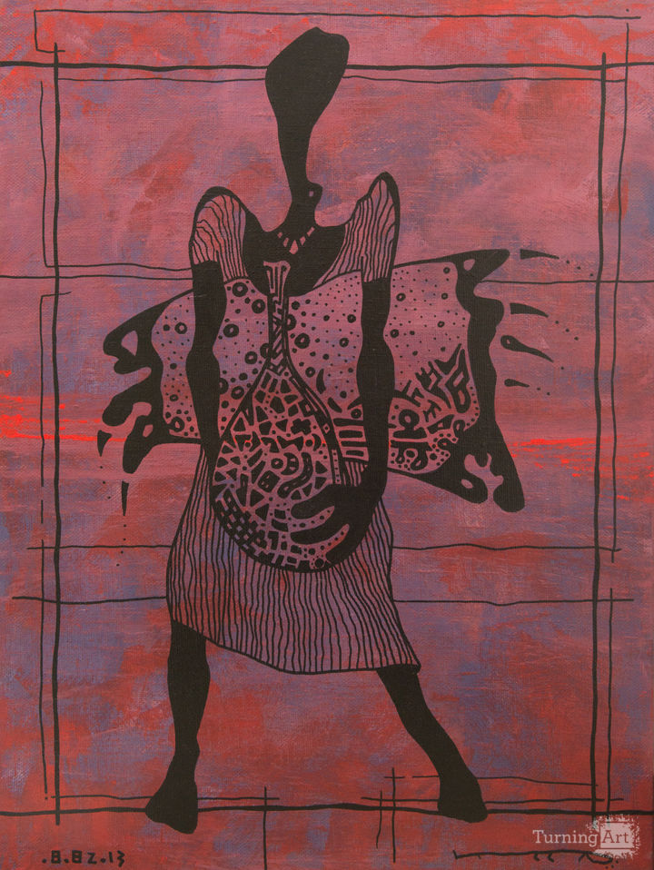 One of the artworks from ‘African passion’ cycle. Red, tribal, with a distinct body-painting and primarily female figures in the centre.