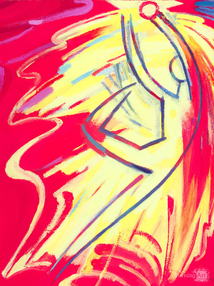 This painting is an homage to Isadora Duncan, arguably the first modern dancer. Born on May 27, 1877, Isadora was free-spirited to the core and believed movement comes from within, like rays emanating from the sun. Bathed in light, the twirling, leaping dancer with lifted arms is holding a ball that represents the circle of life.