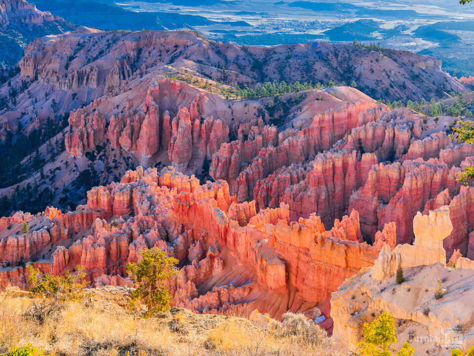 Dawn rays light up colored rock spires at Bryce Canyon, as winter snows melt away. Each new day will bring new spring growth, accentuating the red and orange spires with bright green growth.