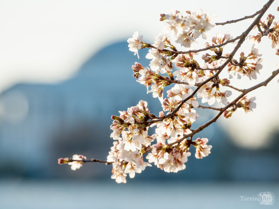 Cherry blossoms and Jefferson Memorial, Tidal Basin, Washington, D.C., in morning light. Color photograph showing branches with blossoms in the foreground and the Jefferson Memorial blurred across the water. 2017.