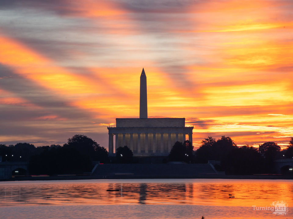 Dramatic crepuscular rays frame the Washington and Lincoln Memorials in Washington, DC with the Potomac in the foreground.