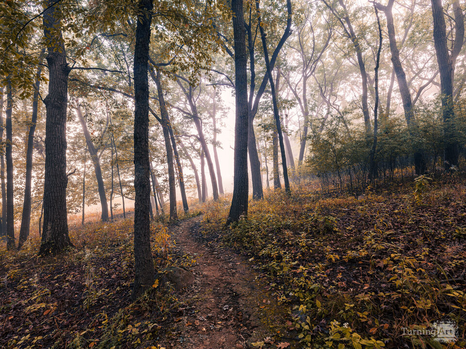 A winding trail leads through tall trees in this serene forest scene, capturing the quiet beauty of the Ice Age Trail in Delafield, WI. Early morning mist completes the mystical atmosphere.