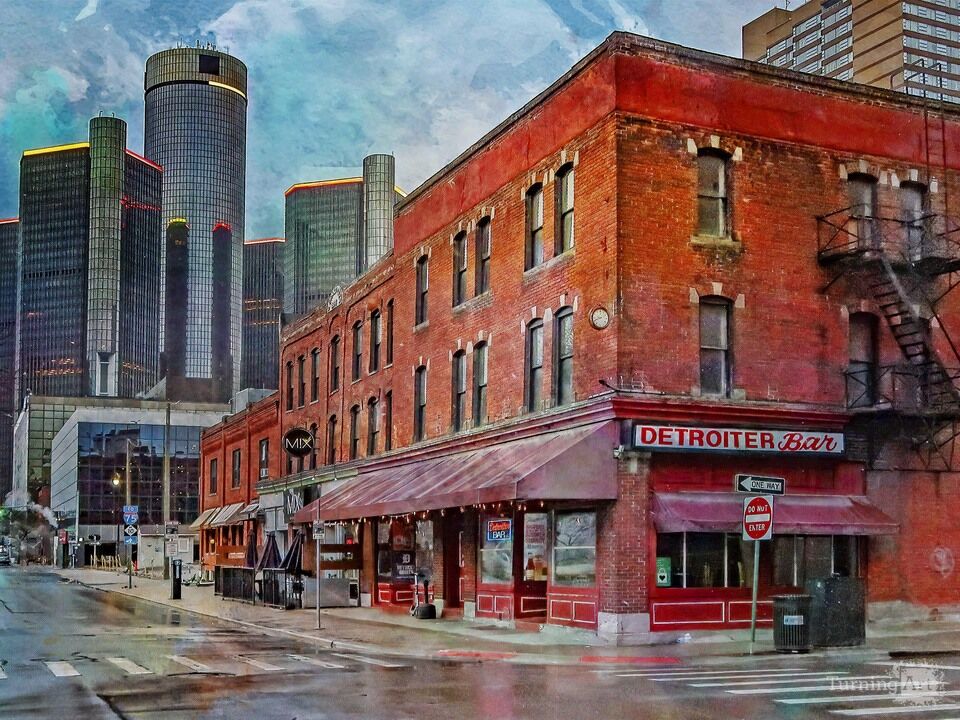An iconic view capturing the soul of Detroit, where historic brick architecture meets the modern grandeur of the Renaissance Center. This striking composition features the classic "Detroiter Bar," a beloved local landmark, standing in vibrant contrast to the gleaming skyscrapers that define the city's revitalized skyline. A blend of grit and aspiration, perfect for those who appreciate Detroit's rich history and dynamic future.
