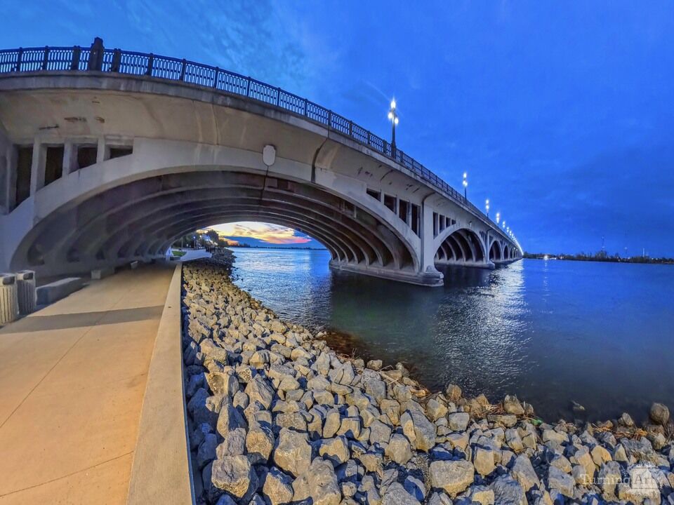 The image showcases the graceful arched spans of the MacArthur Bridge, a historic structure built in the 1920s.