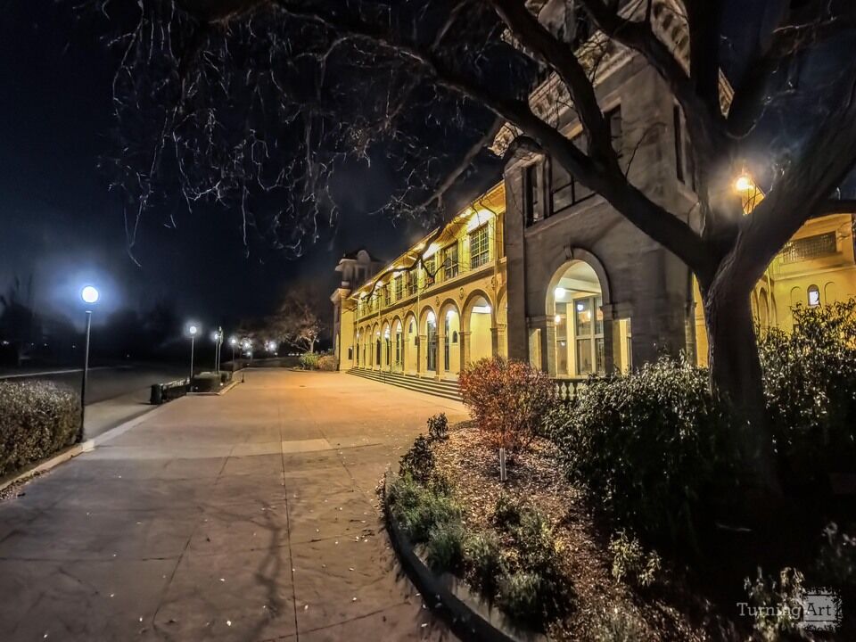 The Belle Isle Casino glows warmly against the night sky, its historic arches and stone façade illuminated by soft golden light. Bare tree branches frame the scene, their silhouettes stretching overhead and adding a quiet, wintry elegance. The empty walkway leads the eye toward the building, creating a sense of calm and timelessness, while evenly spaced lampposts guide the path through the park. This nighttime view captures the serene beauty and architectural grace of one of Belle Isle’s most iconic landmarks.