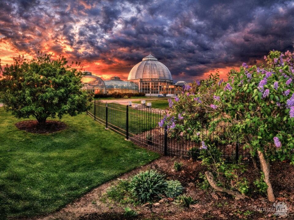 This dramatic photograph captures the iconic Anna Scripps Whitcomb Conservatory glowing beneath an intense sunset sky on Belle Isle in Detroit.