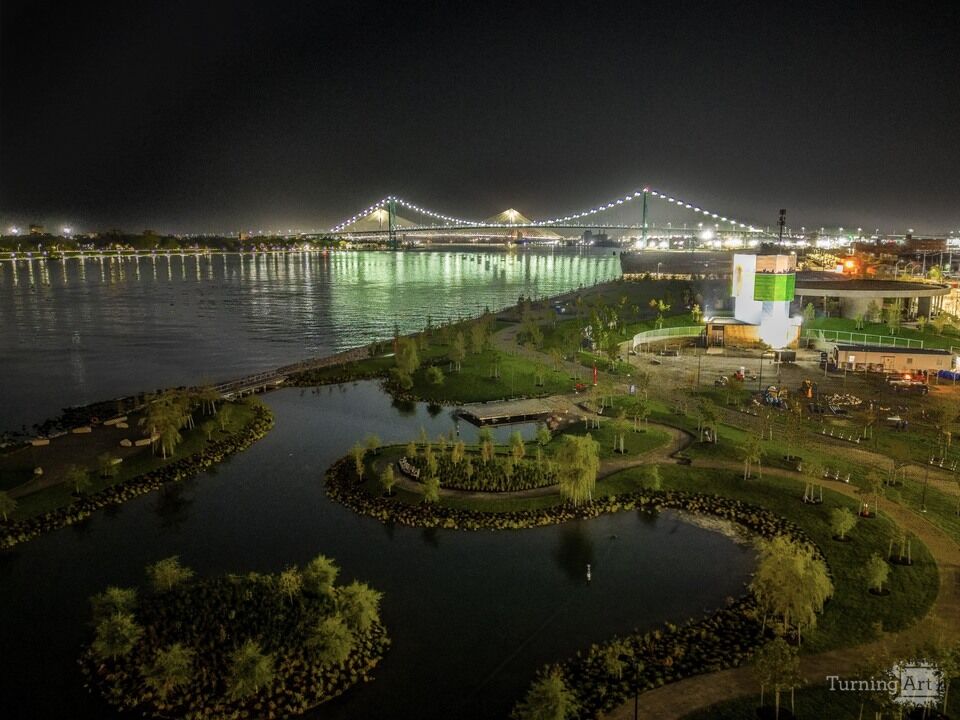 This image presents a stunning nighttime aerial view of the Ralph C. Wilson, Jr. Centennial Park along the Detroit Riverfront. The foreground showcases the park's illuminated pathways, lush green spaces, and a distinctive water garden, winding through the landscape and reflecting the ambient lights.