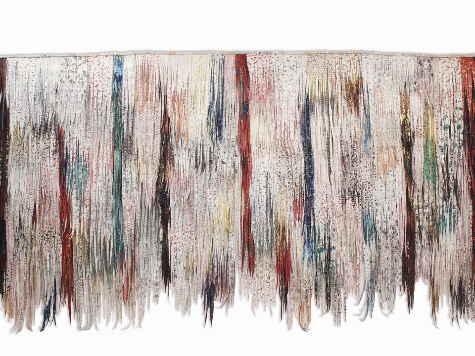 Mural format piece made in 3 sections with long strips of screen printed sheets in primarily long white feathers punctuated with stripes and partial stripes that echo the patterns seen in ikat weavings. While Christian Devotionals are books dedicated to bringing the reader closer to spiritual life, this devotional is dedicated to bringing me and my viewers closer to a life that is dedicated to the love and protection of our fragile planet and especially its birds. I make the feathers from plastic recycled bags screen printed with images of endangered birds and overprinted with text in endangered languages such as Yiddish, Shorthand, numerous indigenous languages, and excerpts of Rachel Carson's Silent Spring translated into Spanish.