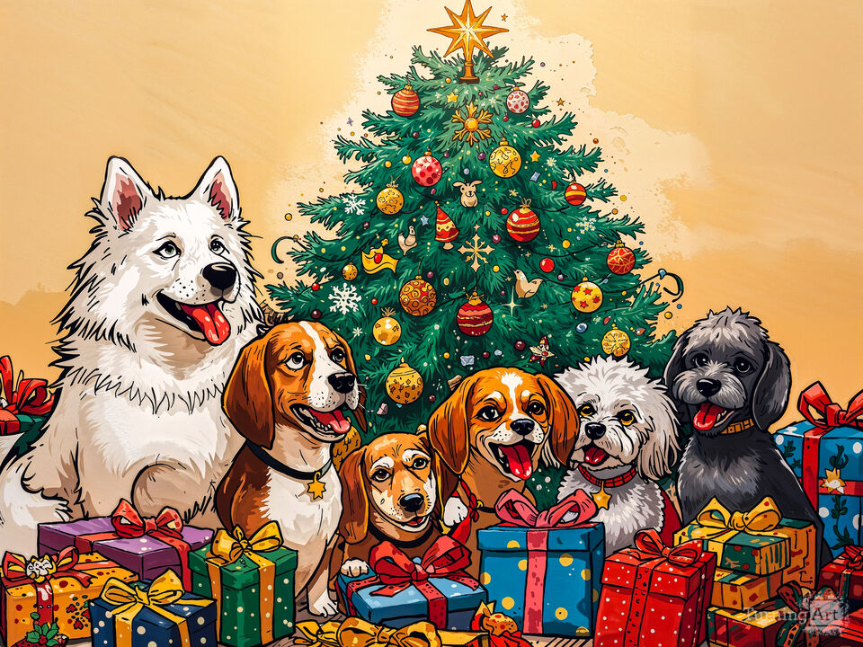 A group of happy dogs is gathered around a Christmas tree adorned with colorful ornaments. Wrapped presents with vibrant bows are spread around the base of the tree. Joyful art created with AI plus other digital editing.