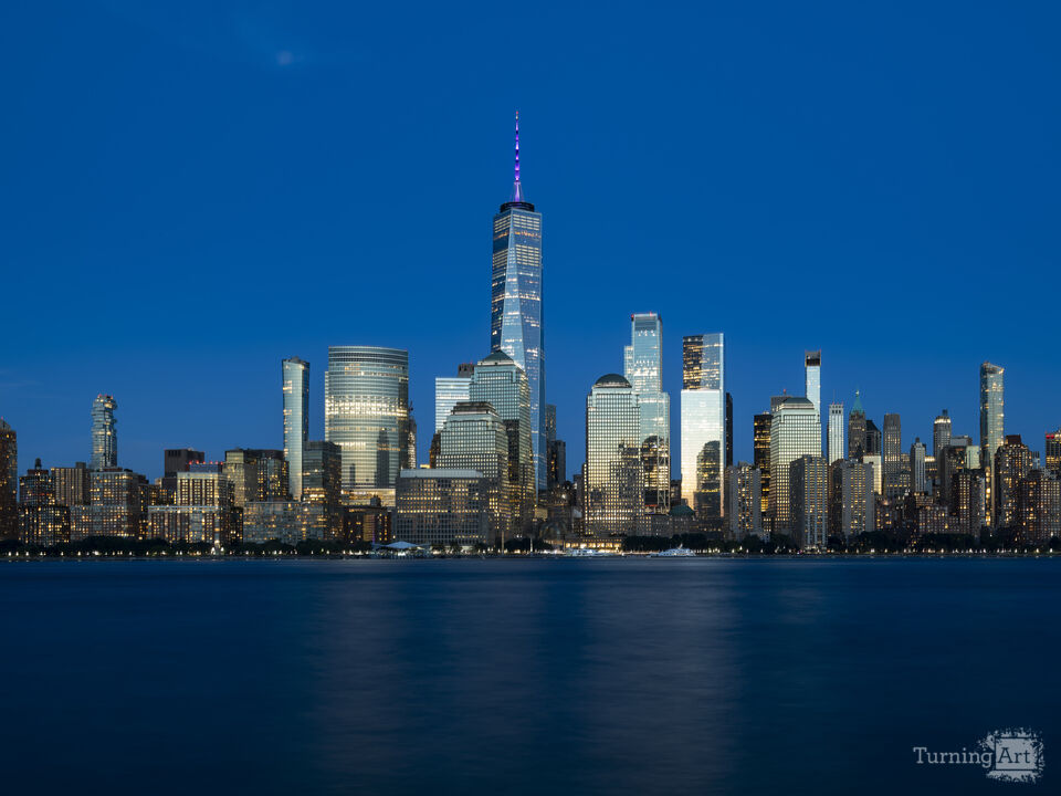 A stunning nighttime view of the downtown Manhattan skyline, seen across the Hudson River from Jersey City, with the towers of the Financial District glowing over the dark, tranquil water.