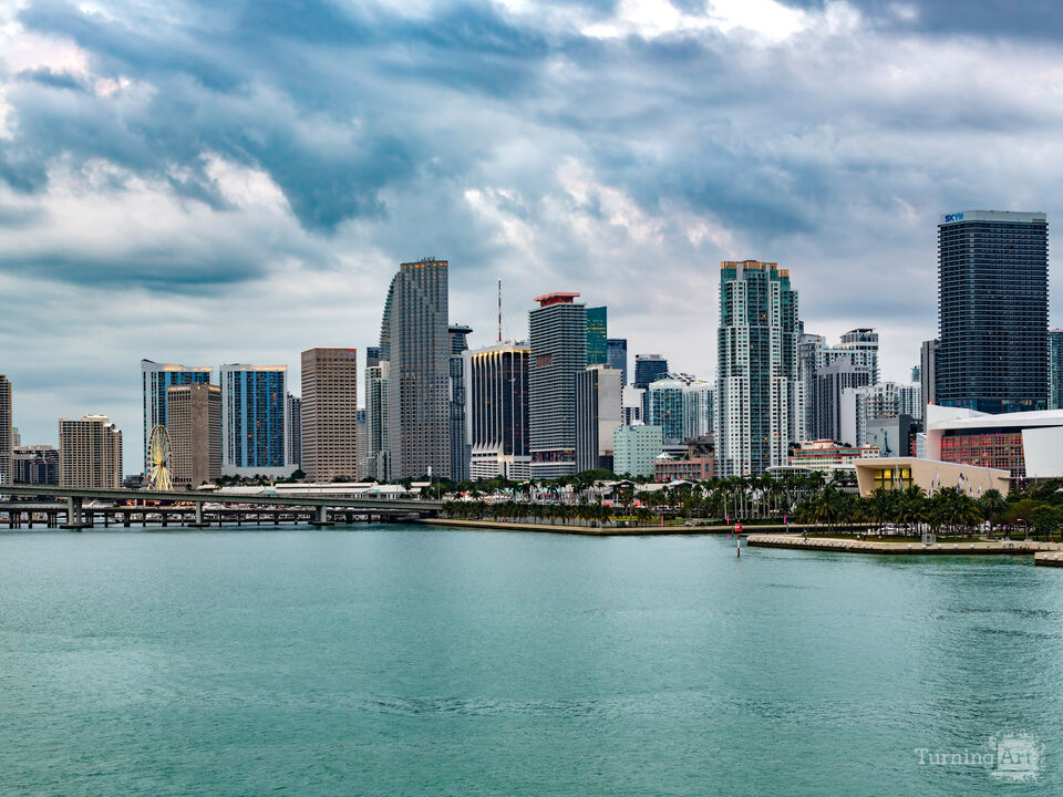 The modern Downtown Miami skyline rises dramatically above the turquoise waters of Biscayne Bay on a cloudy day.