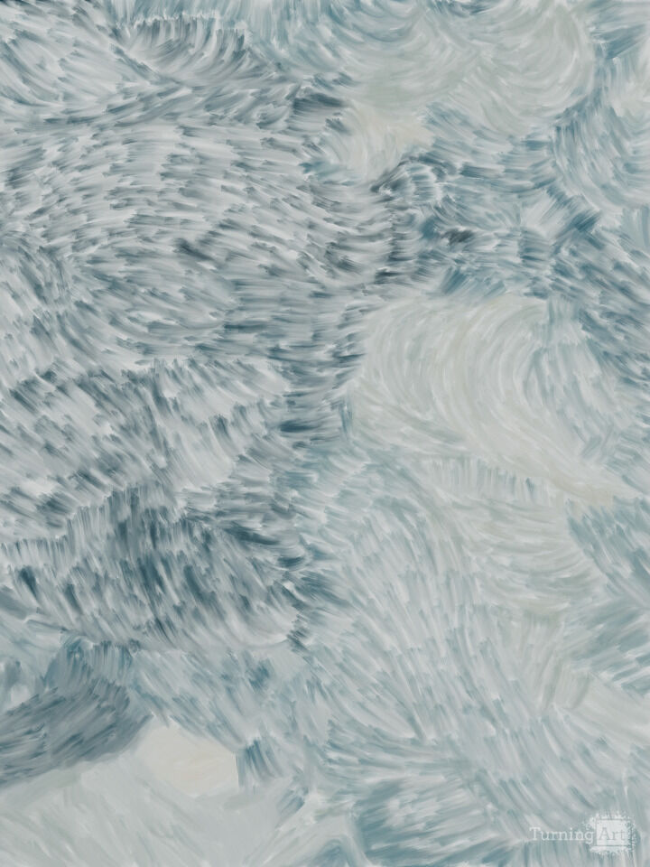 I grew up by the Pacific Ocean, and every morning I would head to the beach just after dawn for a light run. A misty fog would hang in the air, causing little mist droplets to glide their way down to the lazy waves that had yet to regain their full vigor. This artwork is reminiscent of those days, and is made with hundreds of individual brushstrokes. Part of a set.