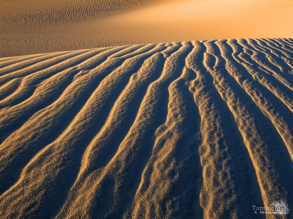 Our first evening photo trek at Death Valley was met with a fierce sandstorm. There was not much opportunity for camera setup or shooting for much of the hike. That said, we were grateful to find this abstract scene and a few others in the aftermath of the storm, with dunes basking in warm sunset light. The storm wiped away footprints, giving us a fresh set of ripples and other rich visual elements in the sand. Mesquite Flat Dunes