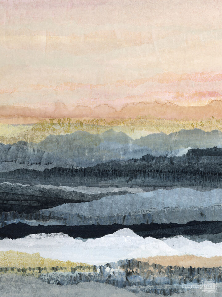 "Dusk Reflections" explores the tranquil beauty of water at twilight through layers of acrylic paint, ink, and translucent wax papers. Soft pinks, deep blues, and warm neutrals capture the gentle transition from day to night as calm waters mirror the fading light above.