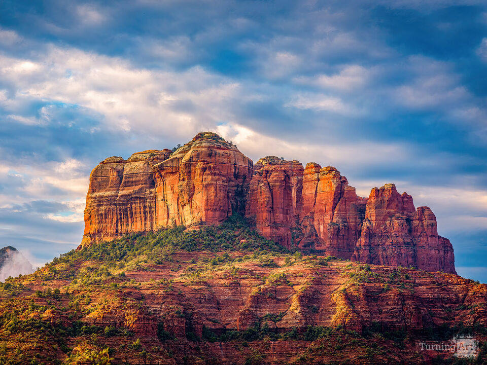 Early morning magic at one of Sedona’s most iconic landmarks. Soft light filters through the clouds, casting warm light on the red rock spires of Cathedral Rock in Sedona, Arizona.