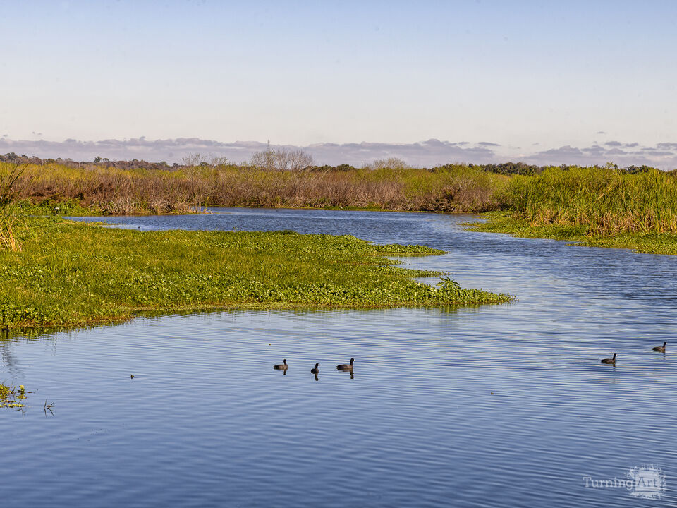 This pond contains American Coot ducks, and turtles popping up for breaths.