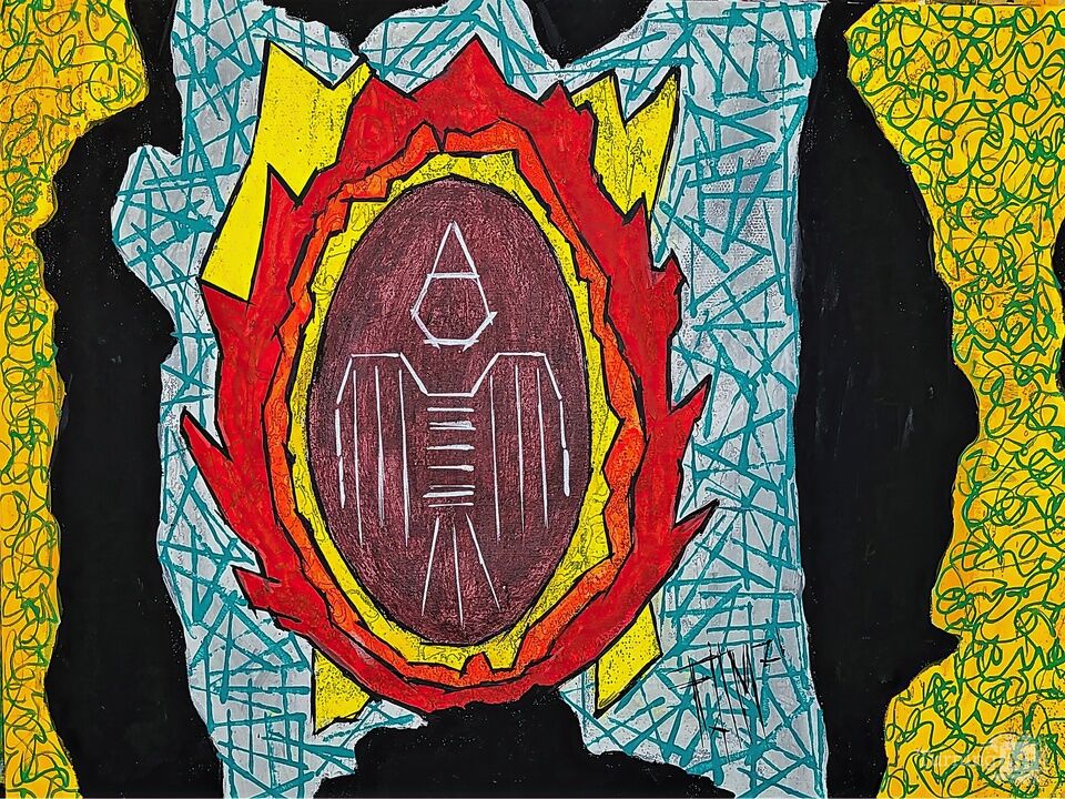 The egg emerges as a symbol across civilizations to reveal myth, cosmos, and rebirth. This piece draws from the egg’s presence in ancient creation stories: from the cosmic egg of Hinduism and the Orphic egg of Greece, to the primordial egg of Egyptian and Chinese lore. The central oval becomes a ritual portal, its geometric bird-like figure a messenger between realms.