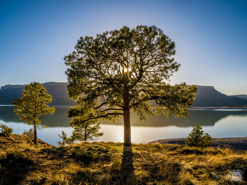 Despite its reputation as a desert, New Mexico does have some beautiful water features. This is El Vado Lake, on the Chama River. The lone Piñon tree stands on the edge of the campground above the lake. I loved the way the sun shone through its branches and lit up the lake behind it.