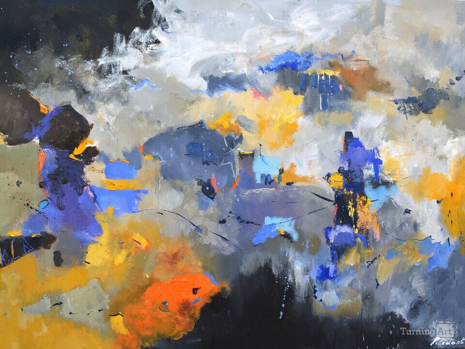 This impressive abstract work boldly blends vibrant shades of blue, yellow, and orange with dark touches of black and gray. The energetic brushstrokes create a surprising dynamic, evoking a scene of harmonious chaos. The bold contrasts between warm and cool colors bring to life a captivating depth, suggesting a kind of dreamscape. The blurred, layered shapes add a dimension of mystery, inviting personal interpretation. The artfully disordered composition denotes the artist's exceptional mastery of abstract art, capturing a moment frozen in time, symbolic and open to the imagination. The work captivates with its balance between spontaneity and intention, revealing an artistic vision that celebrates both the complexity and beauty of the unknown.