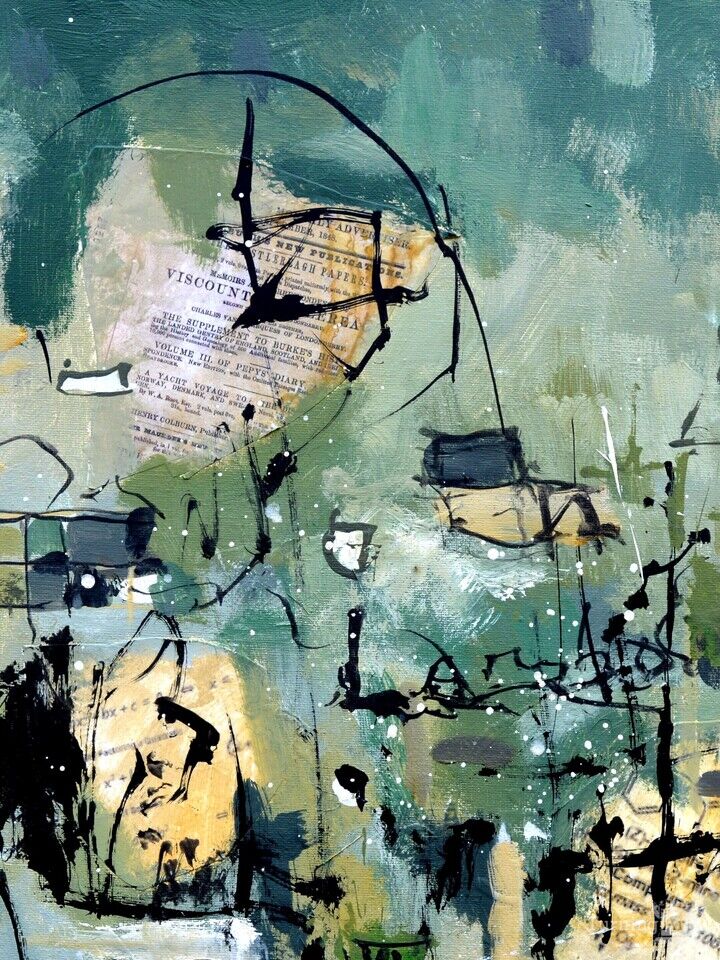 This abstract artwork features a dynamic explosion of color and shape. Dominated by green and black tones, it incorporates geometric elements and flowing lines that boldly cross the canvas. Touches of beige and white brighten the composition, adding unexpected depth. Dense areas of black paint create a powerful contrast with the lighter shades, evoking dramatic tension. Thin, almost calligraphic black lines add a graphic dimension that guides the eye through the work. The signature in the lower right corner indicates the artist's authenticity and personal touch. This painting captures attention with its chaotic energy and seemingly random structure, enticing the viewer to explore every detail. The overall effect is an intriguing visual representation of order amidst chaos.