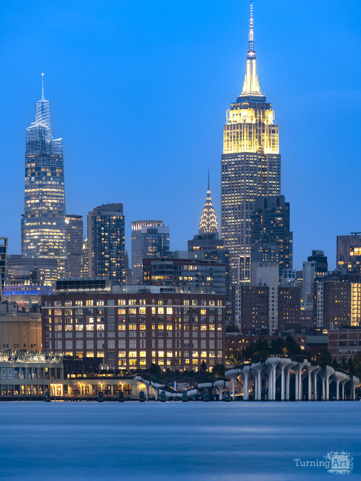The iconic Empire State Building towers over the Chelsea neighborhood and the Hudson River at dusk.