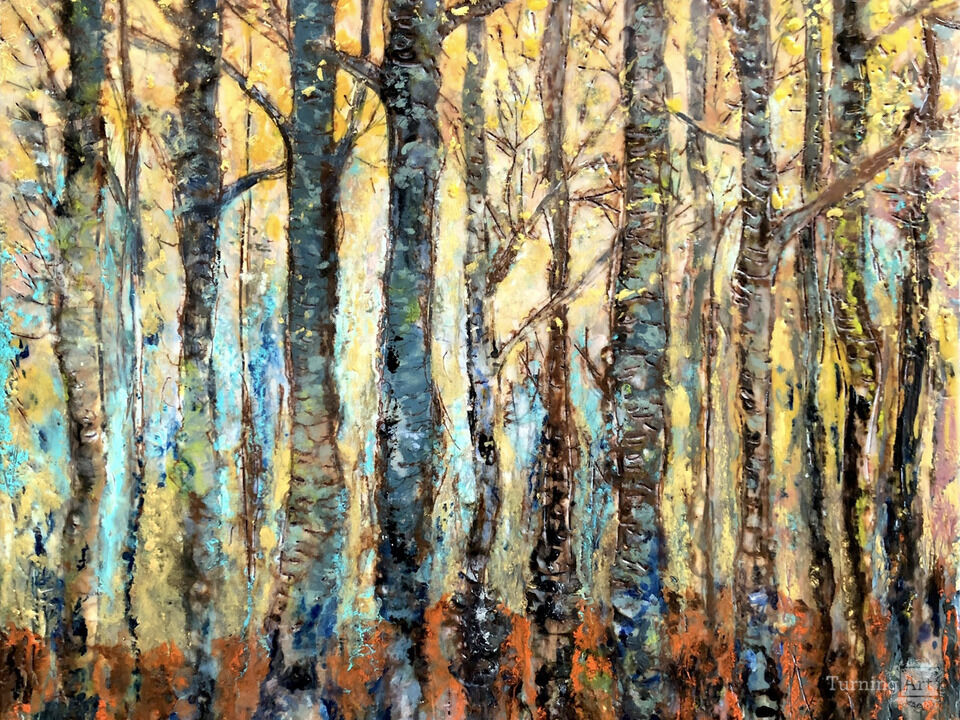 An expressive and lively forest created with encaustic paints and carving on wooden cradle board.