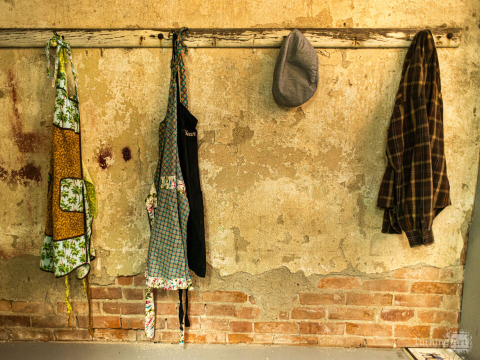 Two vintage aprons, a soft cap, and a plaid flannel shirt hang from a weathered wooden rack against a beautifully aged plaster and brick wall in this quietly evocative still-life photograph. The warm amber light and the peeling, layered plaster surface suggest an old farmhouse, restaurant, or workshop — a space with decades of accumulated life and work within its walls. The personal items on the hooks carry the invisible weight of the person who hung them there, making this a tender, humanistic image about everyday labor and domestic life. The composition is simple but emotionally resonant, ideal for kitchen spaces, farmhouse interiors, or anyone who appreciates the poetry of ordinary things.