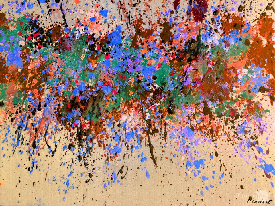 This artwork, clearly created in the style of Abstract Expressionism, depicts an explosion of colors and shapes that instantly captivate the viewer. The canvas is dominated by a myriad of colored spots and splashes, primarily in shades of blue, greenish, and yellow, with touches of red and black. The artist used a dripping technique, similar to that popularized by Jackson Pollock, giving the work a sense of movement and impulsiveness. The splashes seem to be concentrated primarily in the center of the composition, creating a diffuse horizontal form that extends from one side of the canvas to the other. It is as if pent-up energy has exploded, scattering dynamic fragments all around. The density of colors in the center contrasts strikingly with the lighter background, creating depth and dimension that draw the eye toward the vibrant heart of the work. The contrast between dense areas and more airy spaces, as well as the variety of sizes and shapes of the projections, demonstrate a sophisticated mastery of the medium. The thoughtful use of colors invites further exploration, their interaction suggesting deep and complex emotions. This painting is not a mere demonstration of technique, but a true immersion in organized chaos, an invitation to lose oneself in a universe of color and movement. The visual impact is reinforced by the discreet signature in the lower right corner, subtly recalling the artist without distracting from the overall composition. This work is a perfect example of the emotional and visual power that abstract art can achieve when executed with skill and passion.