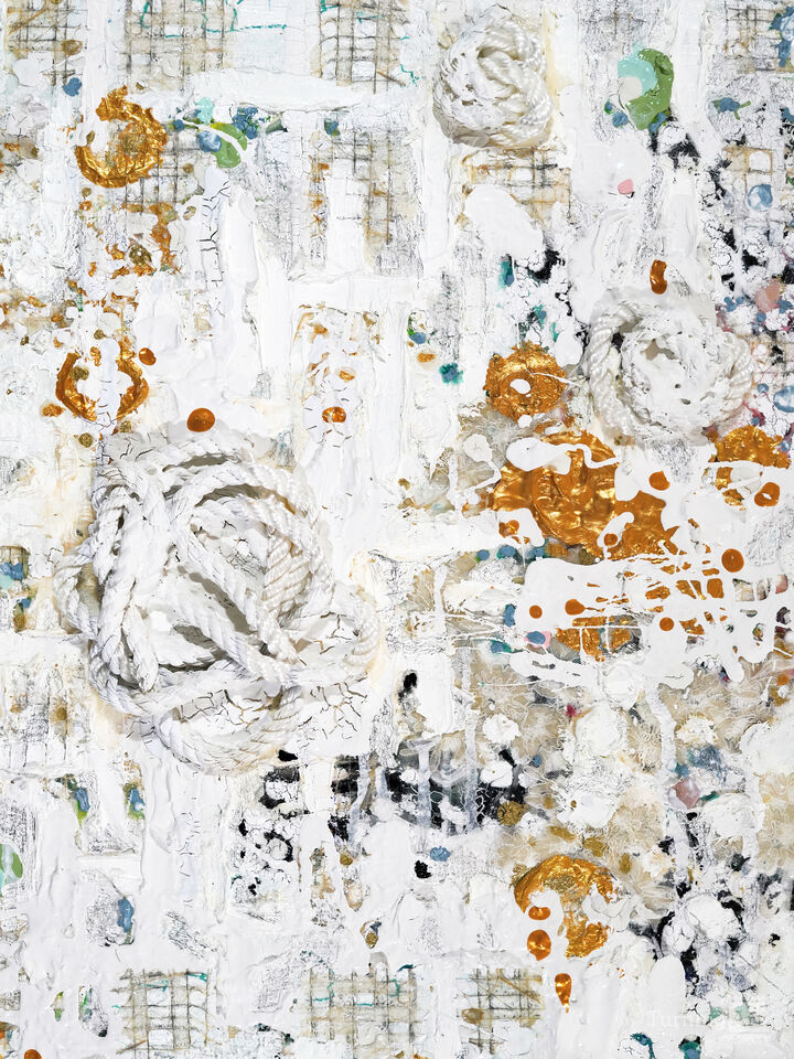 In this painting and many of the paintings I have been doing this year I have been incorporating found rope. I’m drawn to the way it naturally winds and coils, creating depth, patterns and textures that both visually and emotionally appeal to me.