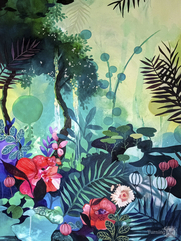 Escape Plan invites you to escape into it's lush green, growing interior. Painted as the winter days wane and longing for Spring ahead. It melds the fantasy with a little mid century modern in an unlikely space.