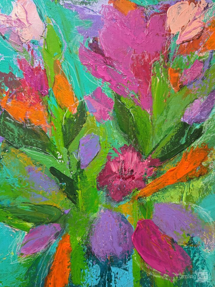 Using a palette knife and created from imagination, this painting includes layers of ink, white and black charcoal and acrylic paint to create an abstracted vase of flowers.