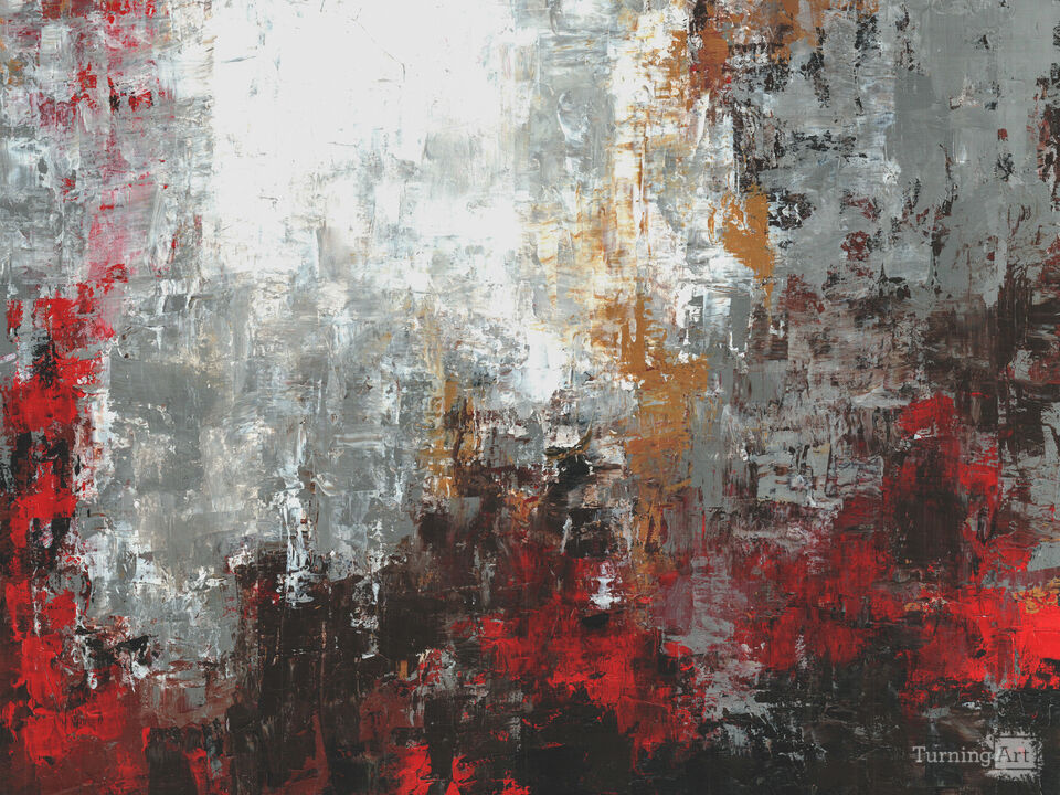 High-contrast, bold, and impressive acrylic abstract painting. A splash of red and gold tones creates a feeling of warmth, similar to a fireplace on a cold winter day.