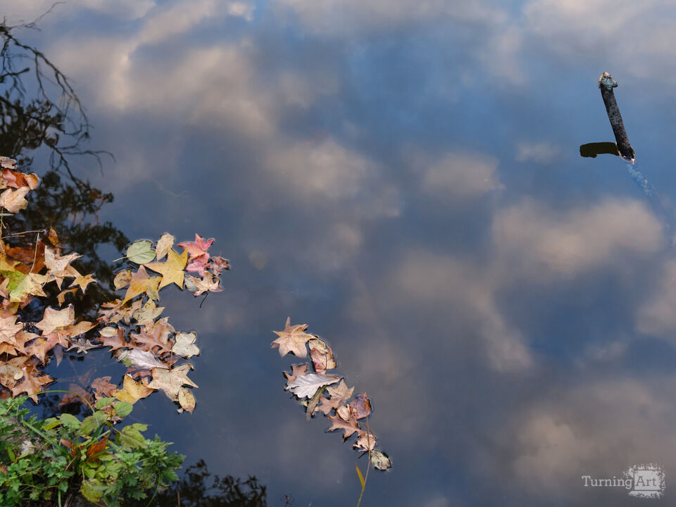 Evening dusk clouds reflected in a small and calm pond with pastel colored autumn leaves in the foreground at Bellevue State Park in Pennsylvania