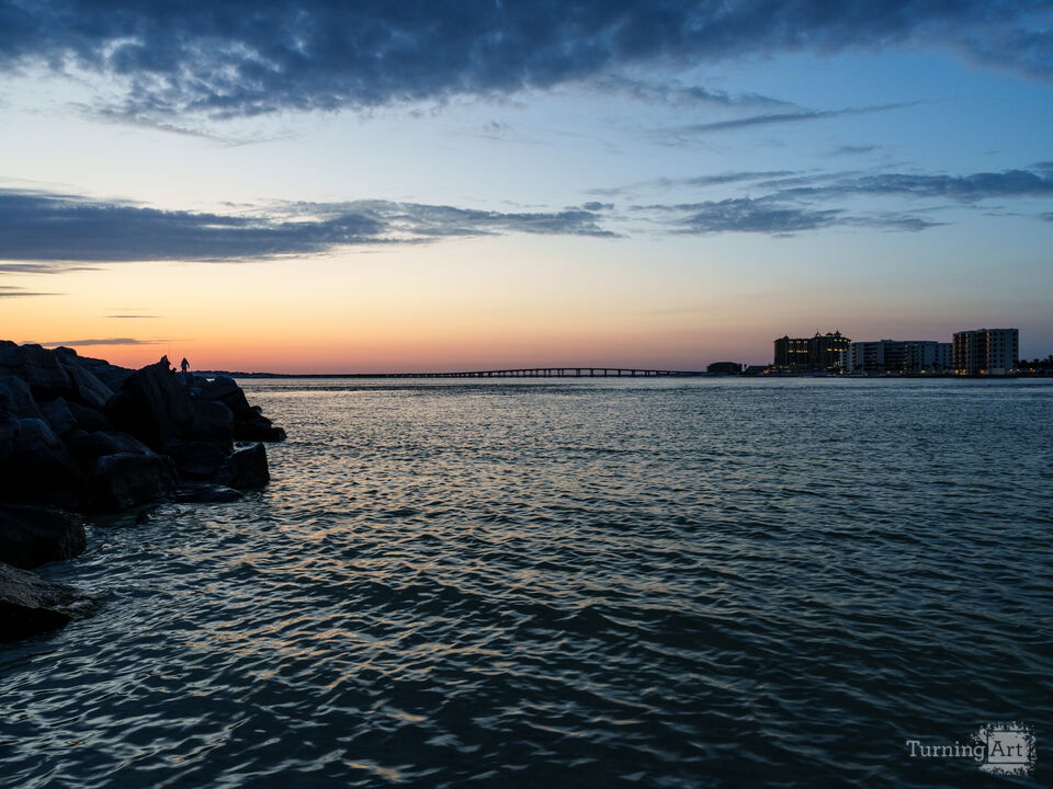 Gentle waves roll around a rock jetty just after sunset in Destin, Florida, where four fishermen stand in silhouette against the fading evening glow. The soft light reflects across the water, creating a calm and peaceful coastal mood. In the distance, Destin Harbor comes into view along with the iconic Destin Bridge and William T. Marler Bridge stretching across the channel. Located along the East Pass, this scenic waterway connects Destin Harbor to the Gulf of Mexico, capturing a quiet afterglow that beautifully reflects the charm and natural beauty of Florida’s Emerald Coast.
