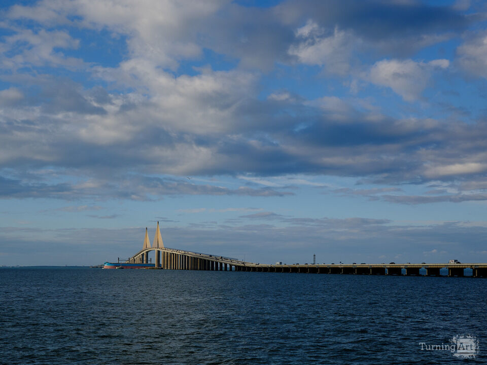 Evening light illuminates the Top Span of the Sunshine Skyway Bridge spanning Lower Tampa Bay in Florida as a large Freighter travels underneath through the channel