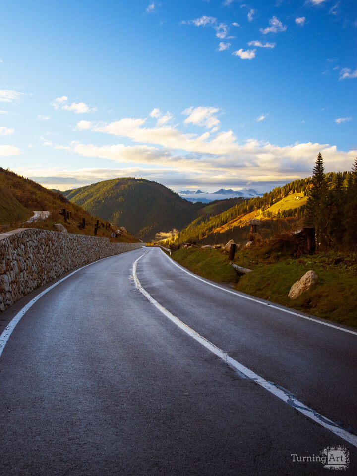 I love including roads in my landscapes. I crossed this one to get to Karersee in the Dolomites and noticed how it dipped down into the valley, appearing to cut a clean line through the mountains.