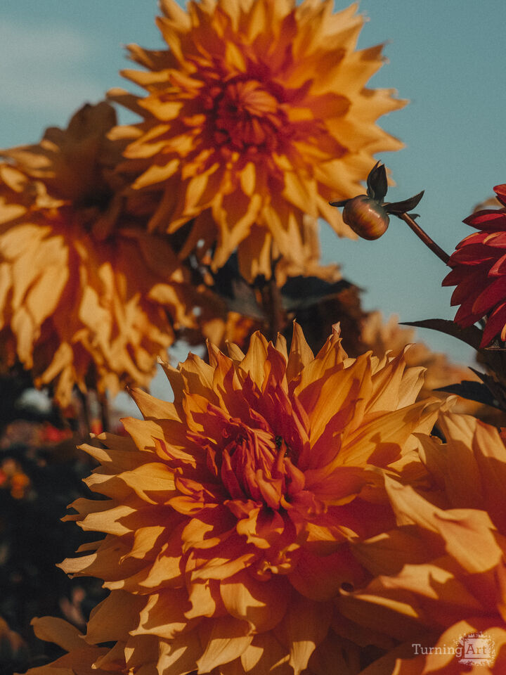 A happy colorful botanical photograph of dahlia flowers blooming in an Autumn garden.