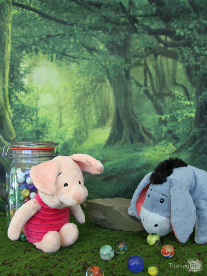 Eeyore & Piglet play marbles in an enchanting forest setting. This tableau photo was created by harvesting multiple pictorial elements including beautiful 80 year old marbles. They dwell in a place of peace and contentment; a safe haven in which to dream and enjoy the innocence of childhood.