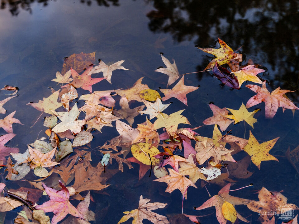 Autumns fallen pastel colored leaves sit calmly on a calm pond at Bellevue State Park in Pennsylvania
