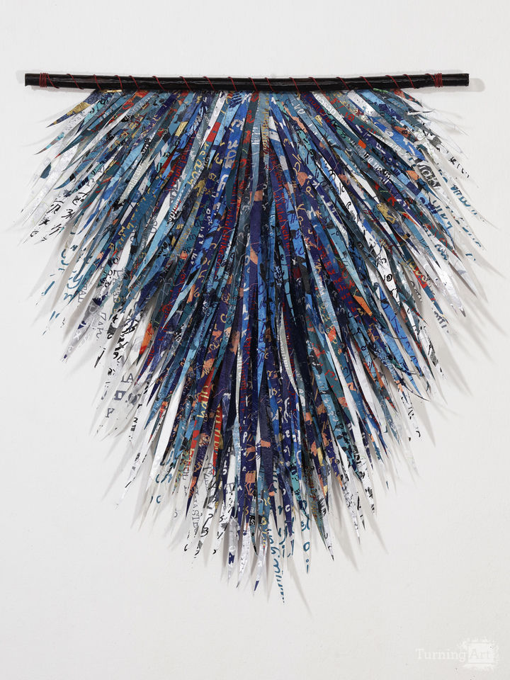 Feather Triangle Blue 1 heralds the return of my triangles, however, using the new recycled plastic feathers instead of the fiber and encaustic used previously. In this piece, which is primarily blue with a white fringe, I have used scraps of feathers from other pieces in my ongoing effort to shrink my own studio footprint. Part of the new smaller works collection.