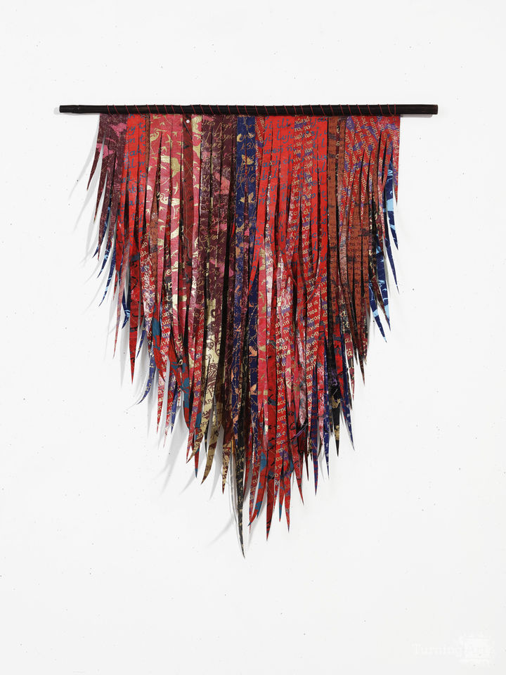A mostly red triangular piece featuring feathers made from plastic recycled bags screen printed with images of endangered birds and overprinted with text in endangered languages such as Yiddish, Shorthand, numerous indigenous languages and excerpts of Rachel Carson's Silent Spring in Spanish. Part of the new smaller works collection