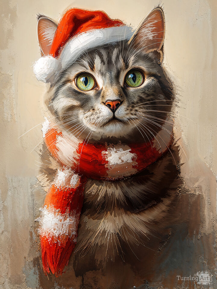A cute tabby cat wears a Santa hat and a red scarf, gazing with big green eyes. The warm tones and adorable expression create a cozy holiday atmosphere. Created with Ai, love, and additional digital editing in a modern painting style.
