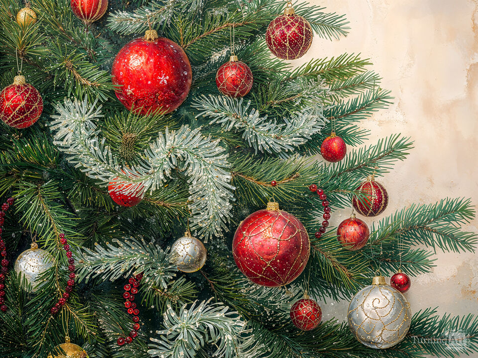 A beautifully adorned Christmas tree with red and gold ornaments. The pine branches are lush and add a vibrant touch to the holiday ambiance. Created with AI, love, and additional digital editing in a modern painting style.