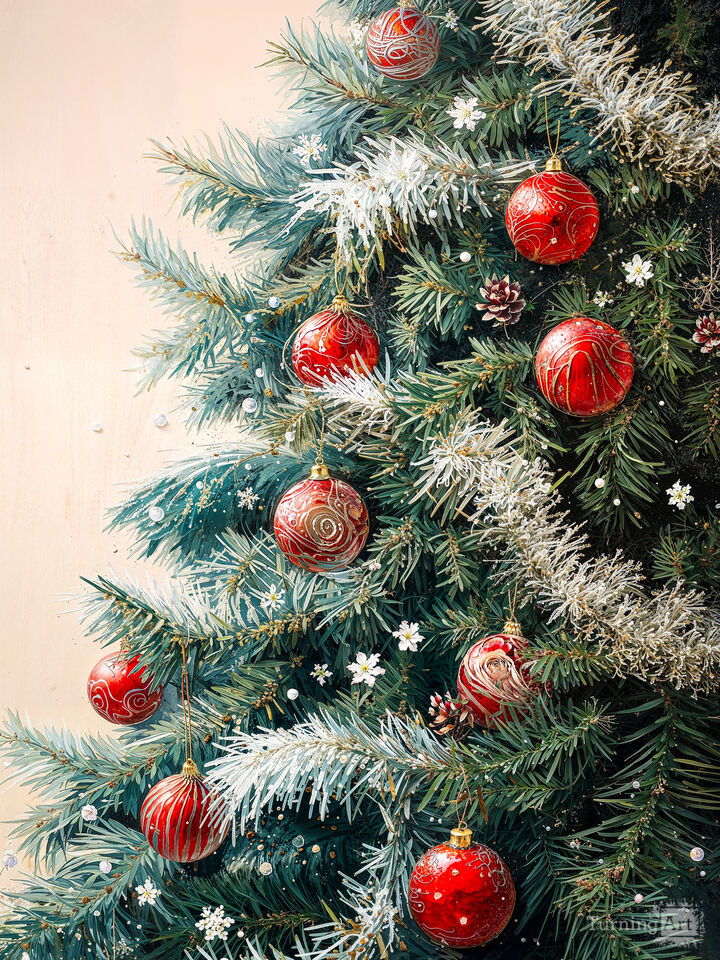 A lush Christmas tree adorned with red baubles and silver tinsel creates a festive atmosphere. Pinecones and delicate snowflakes add seasonal charm. Created with AI, love, and additional digital editing in a modern painting style.