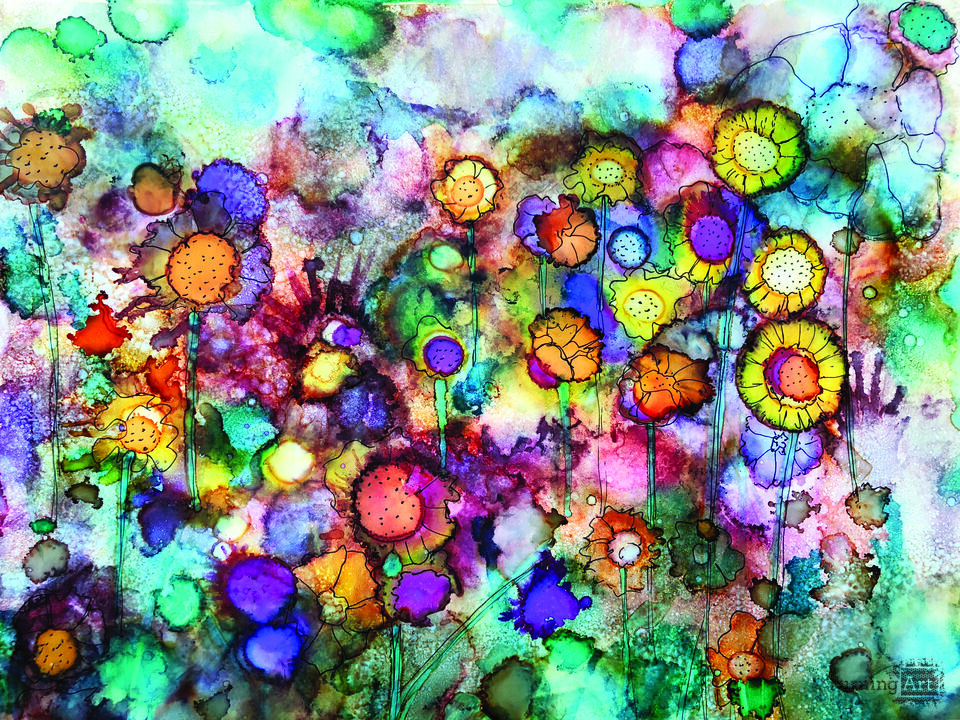 A vibrant field of abstract flowers created with alcohol inks and pen.