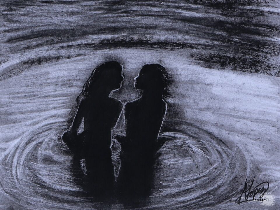 They met where the world dissolved into blue, two bodies, two souls, drifting toward each other in the hush before sunrise. Lucía moved through the water as if she were born from it, her body gliding with quiet devotion. Marisol watched her from the edge, heart stuttering like a wave about to break. The morning light kissed Lucía’s shoulders, and Marisol thought: I have never seen anything so perfect. When their eyes finally met, the air changed. The pool became a mirror, holding the secret of something beginning. They started swimming together every dawn, the only witnesses to each other’s presence. Lucía taught Marisol how to trust the water, how to surrender without fear. Marisol taught Lucía how to see the poetry in every ripple, how to breathe beauty even in exhaustion. Between laps, they would rest, legs tangled beneath the surface, their laughter rising like bubbles. Sometimes Lucía would trace Marisol’s wrist underwater, drawing invisible constellations on her skin. “Every star in me recognizes you,” she’d whisper. Outside the pool, the world was heavier, all noise and rules. But in the water, they could love without apology. There, they were freedom. One night, they swam beneath the moon. The pool looked like melted silver, and when they kissed for the first time, the world seemed to stop breathing. It was necessary, a collision of hearts that had been waiting their whole lives. Afterward, Marisol painted what she felt: two women underwater, their hair swirling like fire, their lips almost touching. Around them floated hearts, fish, and fragments of the moon. In the corner she wrote: “We loved each other in the water, where no one could break us apart.”